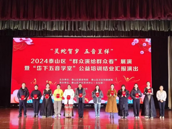 泰山区文化馆“岱下五音学堂”公益培训是泰山区文化和旅游局重点打造的公益文化培训品牌,致力于为广大市民提供免费、优质、专业的文化艺术教育资源,丰富群众的精神文化生活,提升全民艺术普及,培养了众多群众文化人才,为促进社会文化的繁荣发展贡献了力量。此次汇报演出暨颁奖典礼不仅是对过去一段时间培训成果的集中展示,更是对未来文化馆公益培训事业的展望与激励。接下来,泰山区文化馆将继续秉承公益初心,为更多市民点亮文化艺术之光,让文化的芬芳在城市的每一个角落绽放。