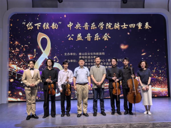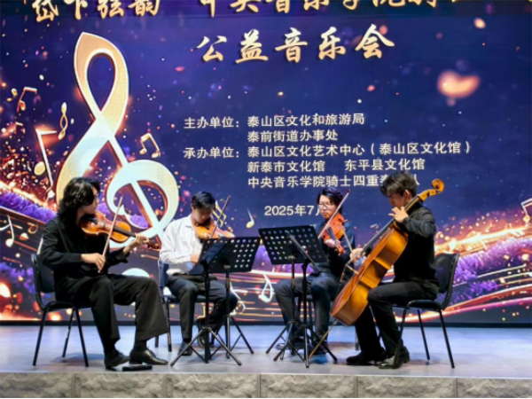 7月12日晚,由泰安市泰山区文化和旅游局、泰前街道办事处主办,泰山区文化艺术中心(泰山区文化馆)等单位承办的“岱下弦韵”中央音乐学院骑士四重奏公益音乐会在泰安印象山前剧场成功举办。音乐会将中央音乐学院骑士四重奏这一高水准的艺术力量引入泰山区,群众在家门口就可以享受到跨越古典与现代的音乐时空对话。