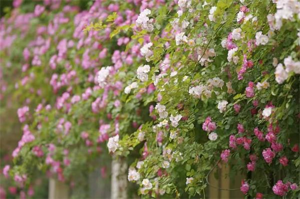 春夏之交,蔷薇花姹紫嫣红、层层叠叠,山东农业大学岱宗校区花墙成为泰城靓丽风景线。