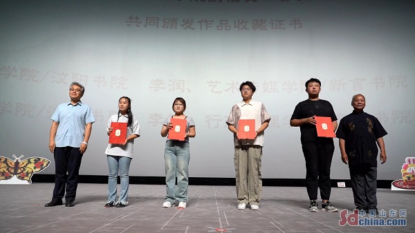 仪式现场,泰安市政协副主席、市文化和旅游局局长朱丽和泰山科技学院校长耿献文共同为泰山科技学院非遗展览馆揭牌。山东省文旅厅非遗处二级调研员王尚和泰山科技学院党委书记彭春雷共同颁发非遗展品捐赠证书。国家级非遗项目泰山皮影戏第六代传承人范正安和泰山科技学院副校长智英斌共同为学生颁发作品收藏证书,并进行了精彩的泰山皮影戏演出,“十不闲”绝技让学生大开眼界,深刻感受到传统非遗的魅力。