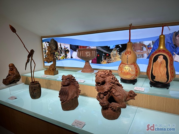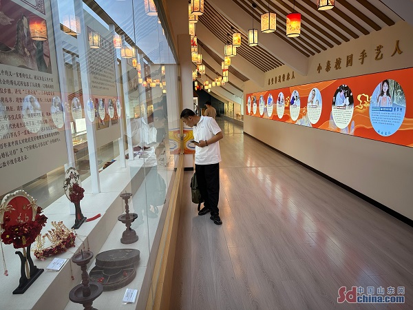 来到全新建成开放的非遗展览馆,“泰山石敢当习俗、泰山东岳庙会、徐家拳、山东梆子”等非遗项目主题墙映入眼帘,馆内摆放着各类蛋雕、面塑、陶艺、泰山玉、泰山剪纸等非遗作品,其中很多都出自于泰山科技学院爱好非遗的学生之手。展览馆以“一天、一年、一生、一山”为主题设计,集中展示泰安地区具有代表性的非遗项目、展现学校校园手艺人的手工创作,不仅为在校学生提供了一个学习和传承非物质文化遗产的空间,也为泰安非遗工作增加了一个展示和传播非物质文化遗产的平台,将有力推动泰安非遗保护传承和创新发展。