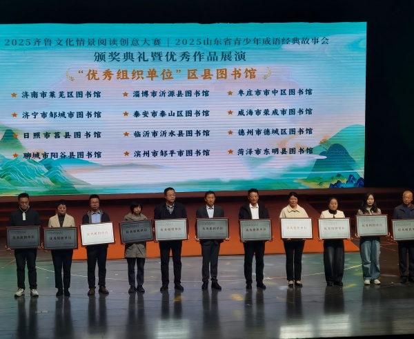 10月26日下午,由山东省文化和旅游厅主办,山东省图书馆、山东省话剧院、山东师范大学承办的“‘2025齐鲁文化情景阅读创意大赛’丨‘2025山东省青少年成语经典故事会’颁奖典礼暨优秀作品巡演”在济南举行。会上,泰山区图书馆凭借在两项省重点活动中的突出表现,获评“2025年全省图书馆重点阅读推广活动优秀组织单位”。全省仅12个区县图书馆获此殊荣。